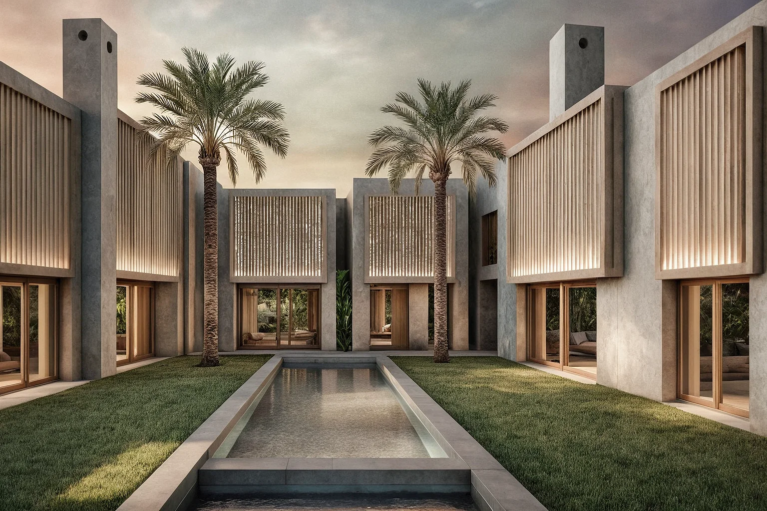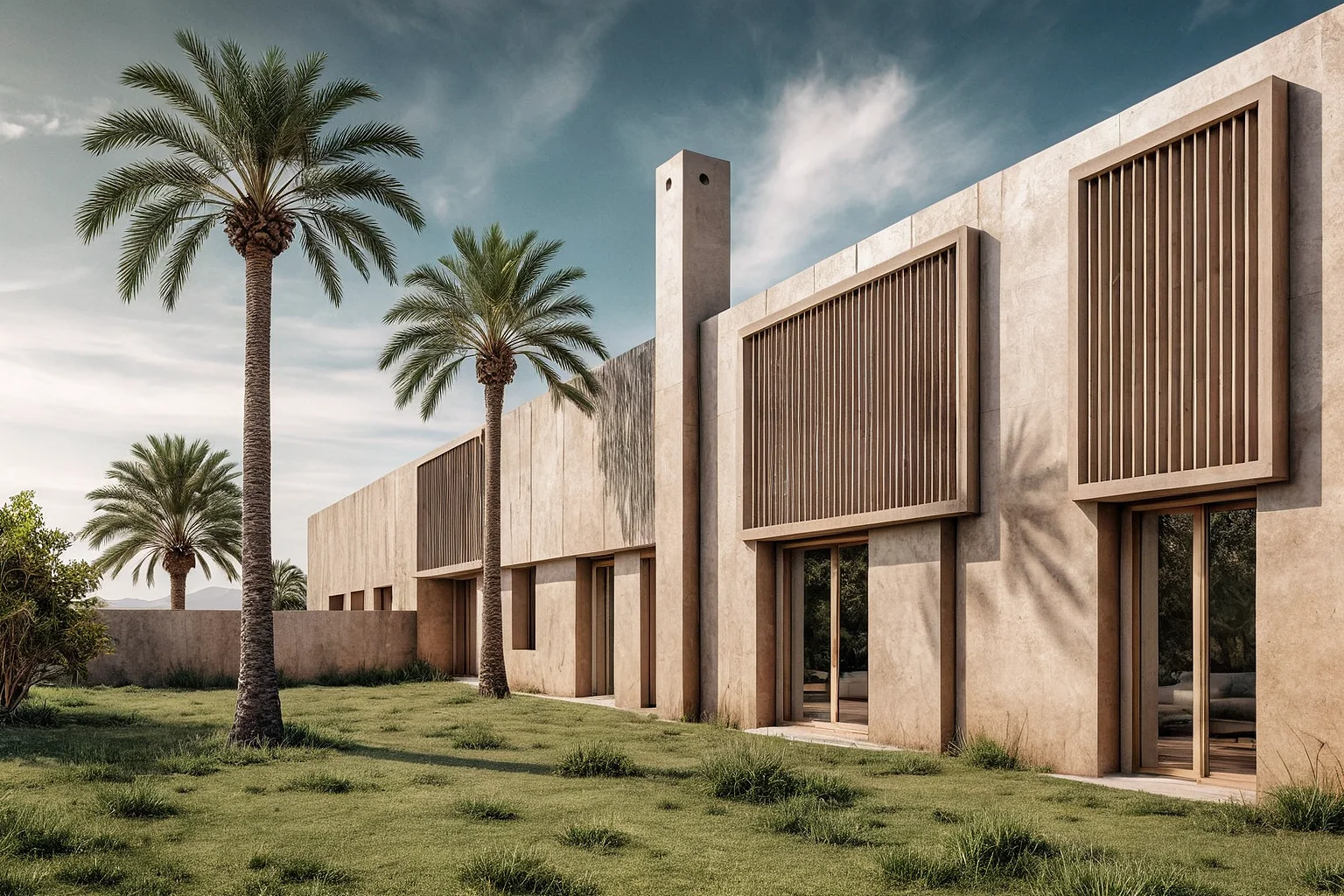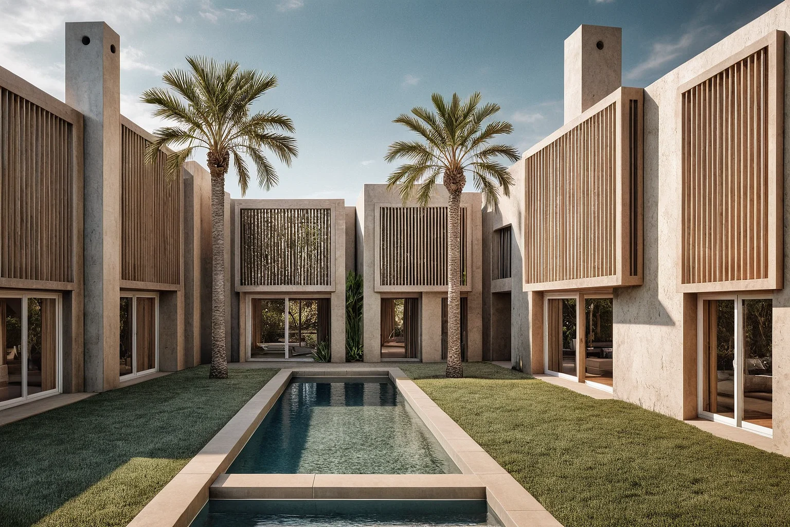 Neutral materials such as white finishes, natural wood, and local stone create a calm and timeless atmosphere. Passive climate strategies improve energy efficiency, while terraces and patios strengthen the connection to the Mediterranean environment. The result is a simple, elegant, and contemporary living experience.