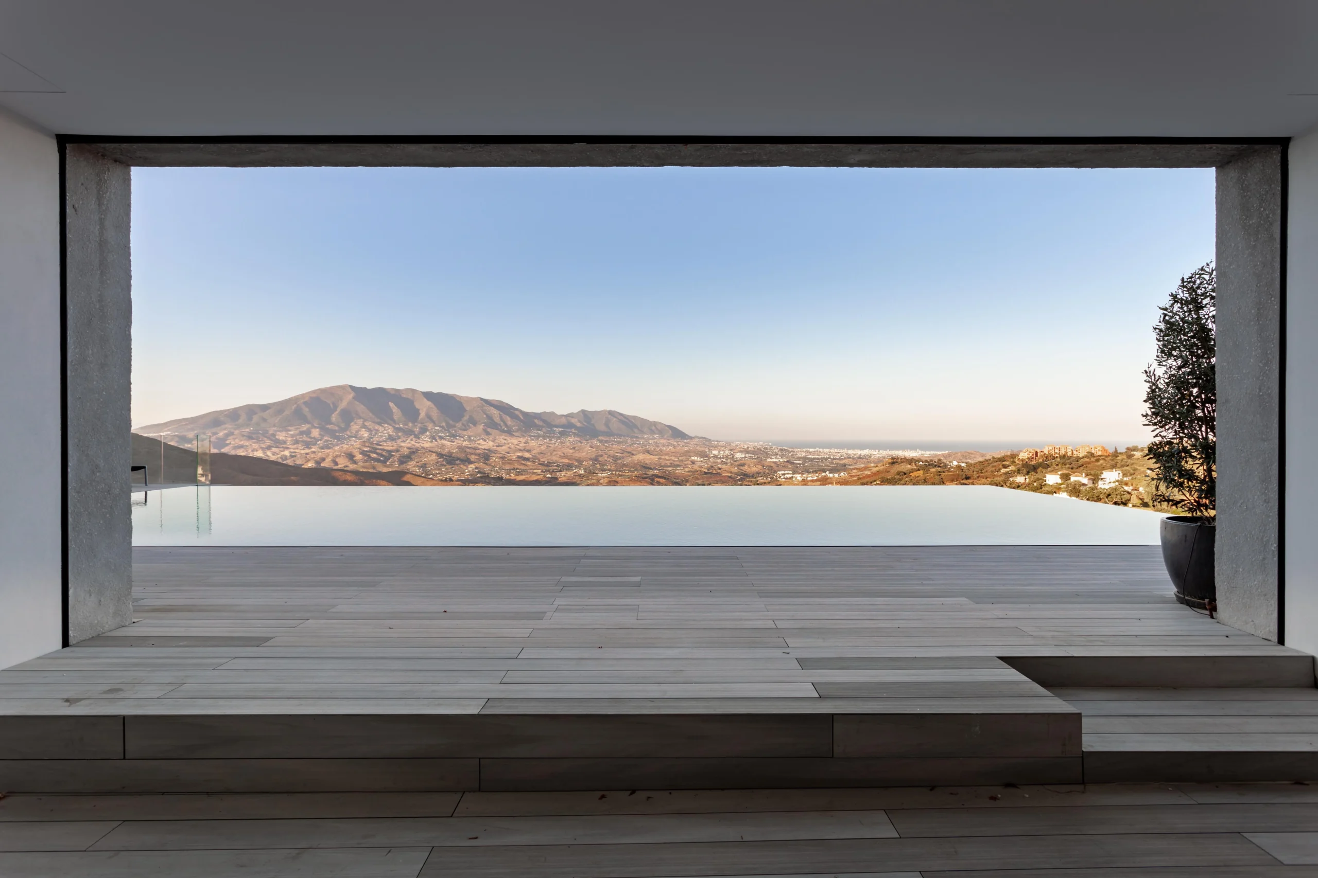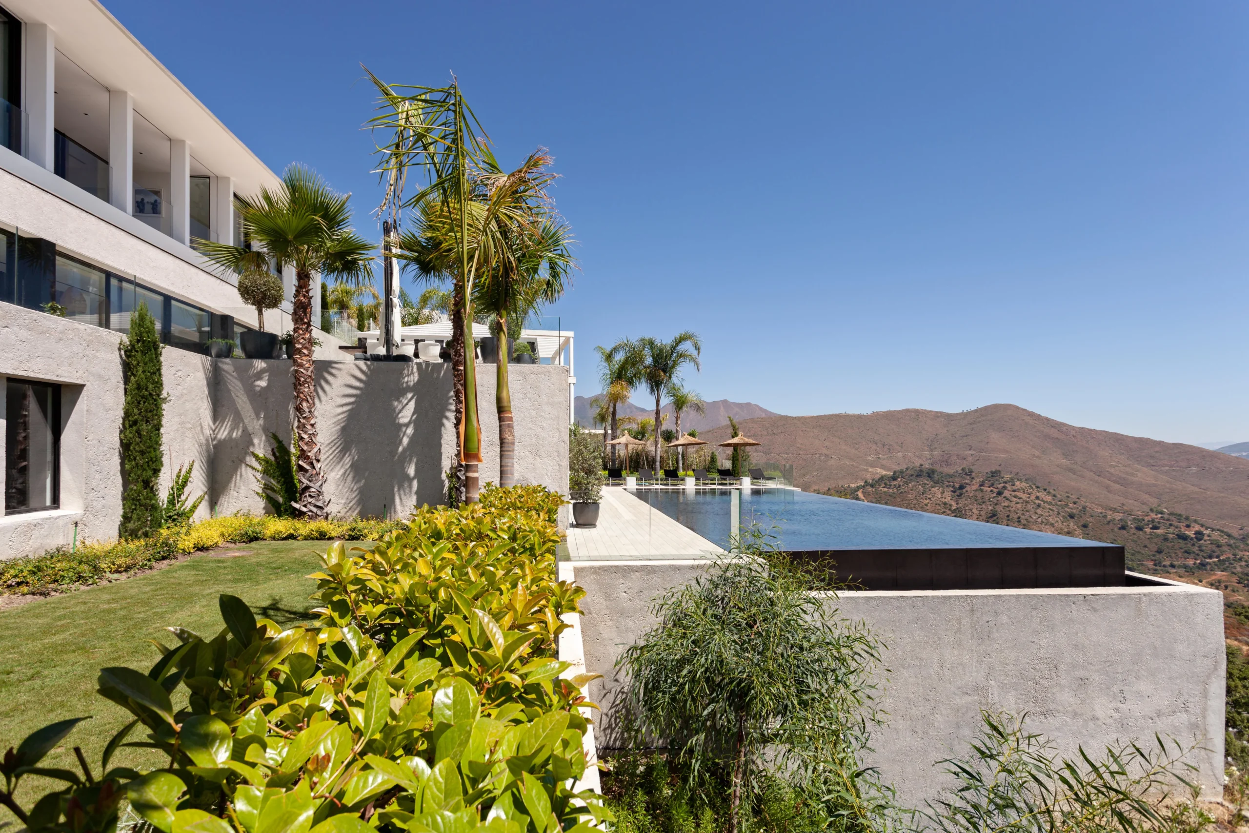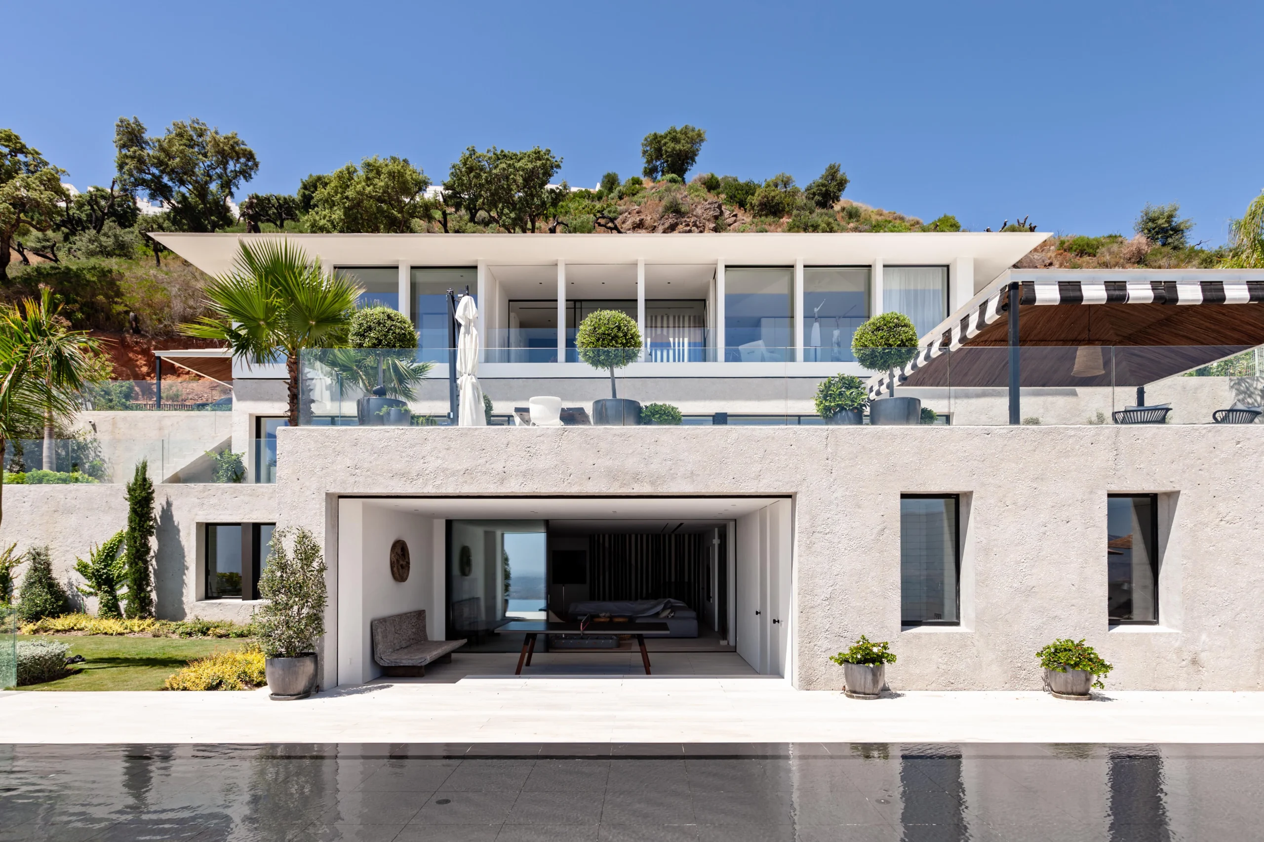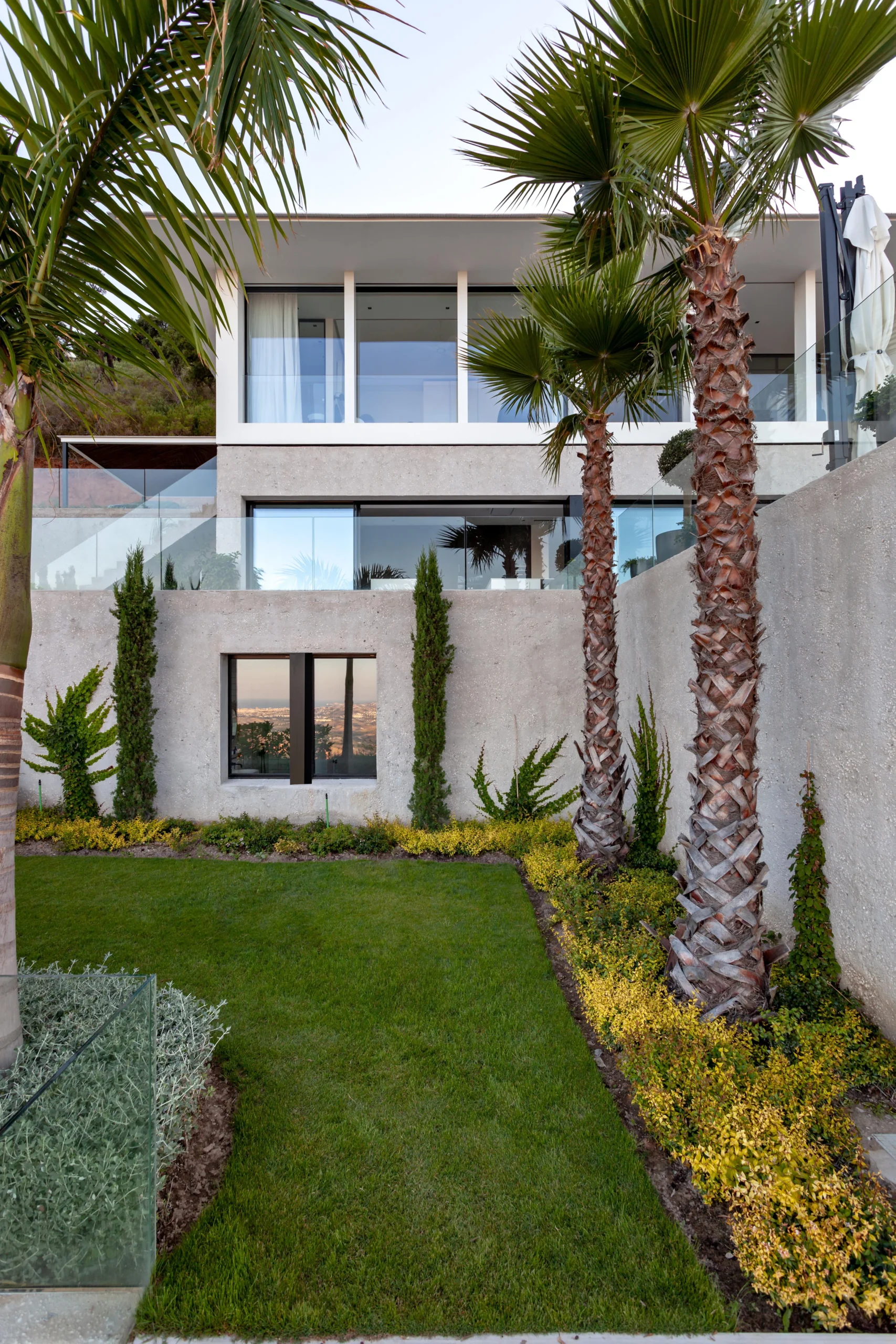 Low rise and low visual impact development. Florence house is a residential development in the hills to the northwest of Marbella. Our proposal for Florence house had to follow the steep incline of the land. The result is an upside down and back to front house: the main bedrooms are on the entrance floor with the large living and entertaining spaces on the floors below; and the front of the house is a mute blank wall, while the back of the house is a series of full width glass windows and doors overlooking the landscape.