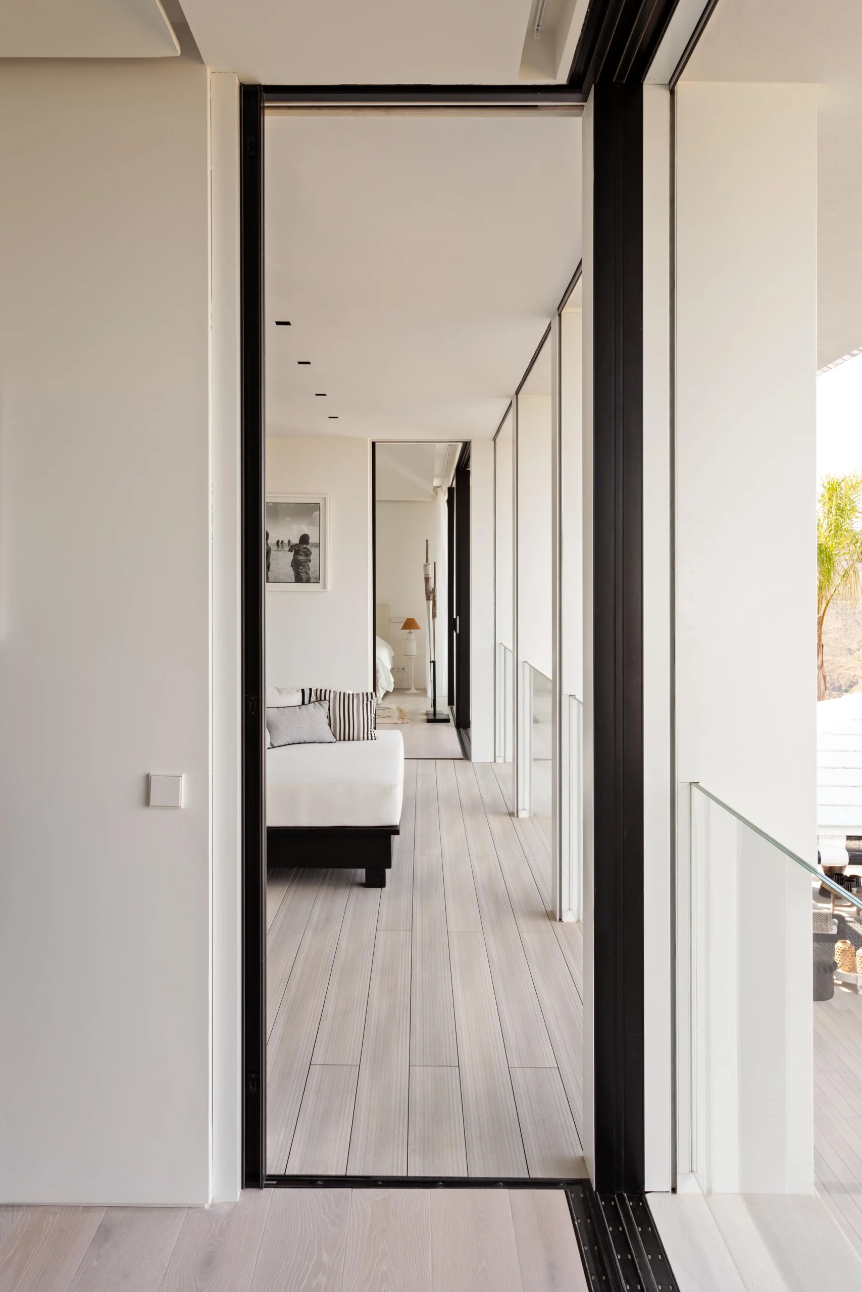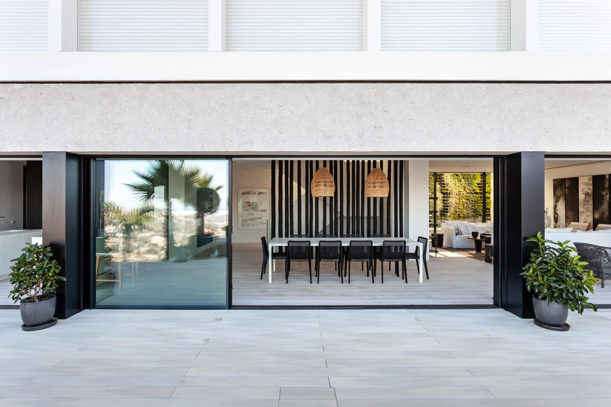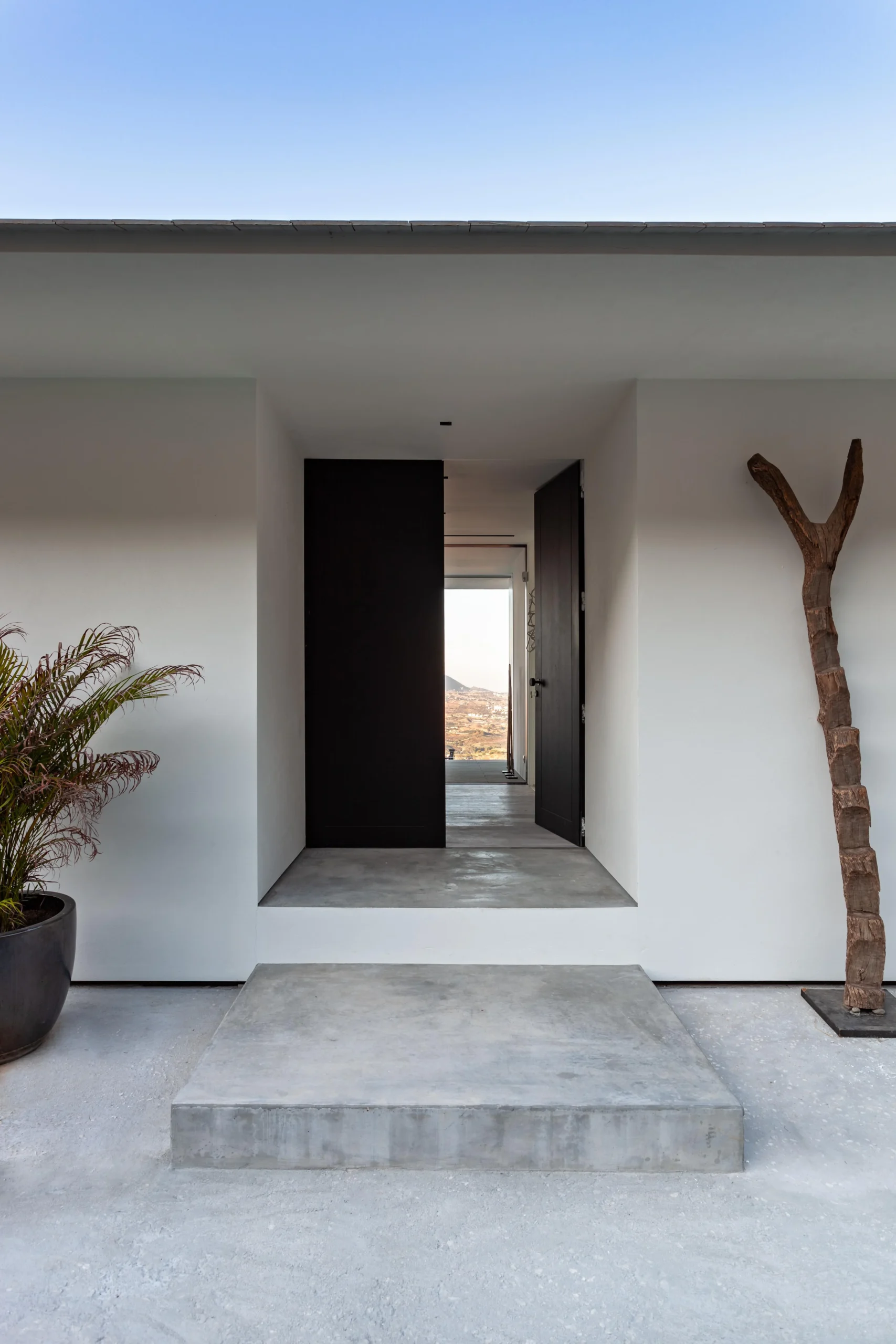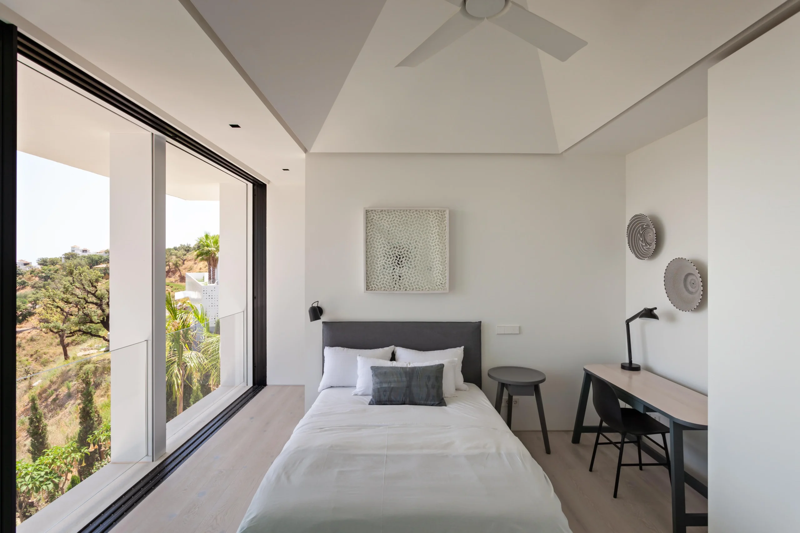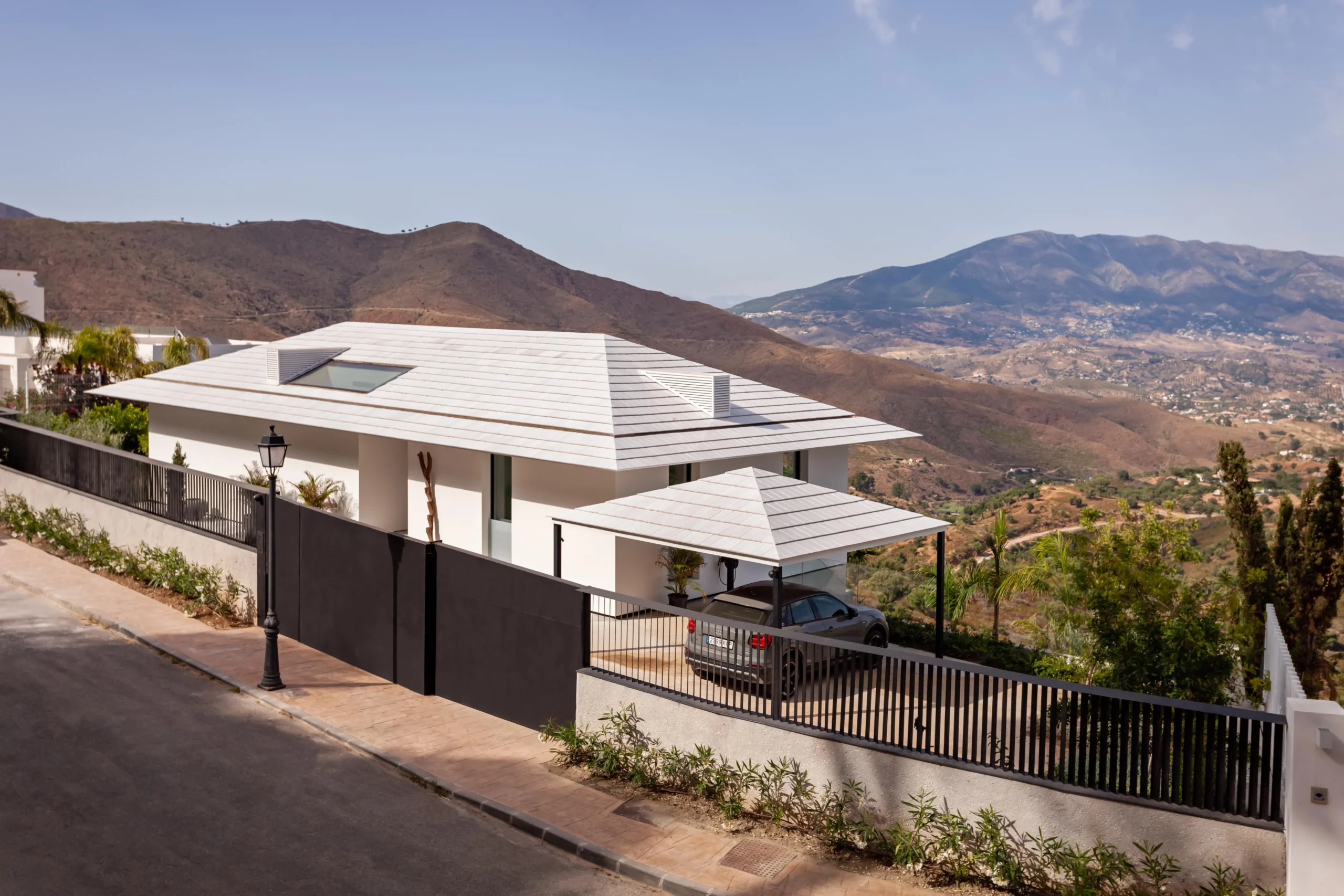 Low rise and low visual impact development. Florence house is a residential development in the hills to the northwest of Marbella. Our proposal for Florence house had to follow the steep incline of the land. The result is an upside down and back to front house: the main bedrooms are on the entrance floor with the large living and entertaining spaces on the floors below; and the front of the house is a mute blank wall, while the back of the house is a series of full width glass windows and doors overlooking the landscape.